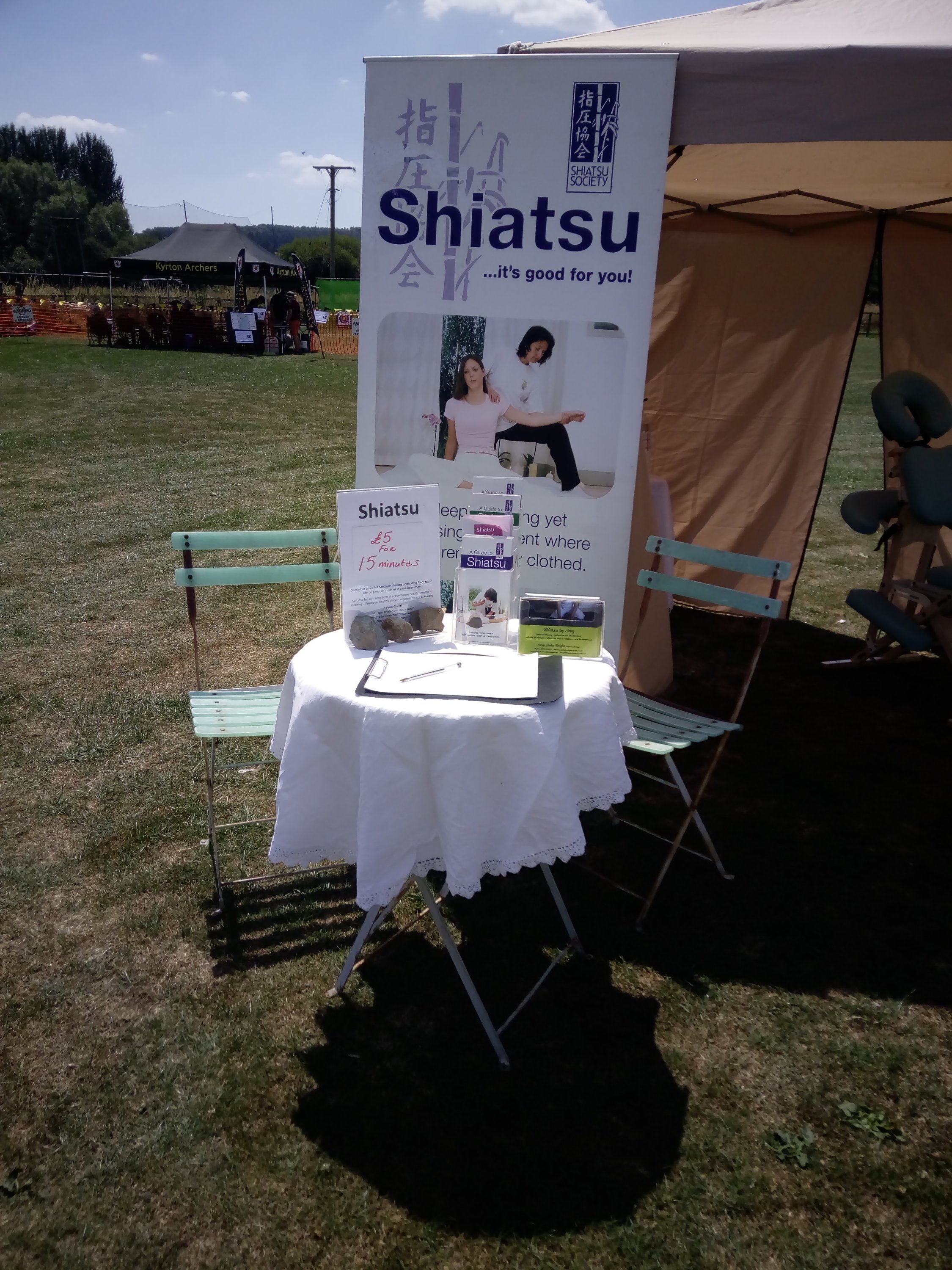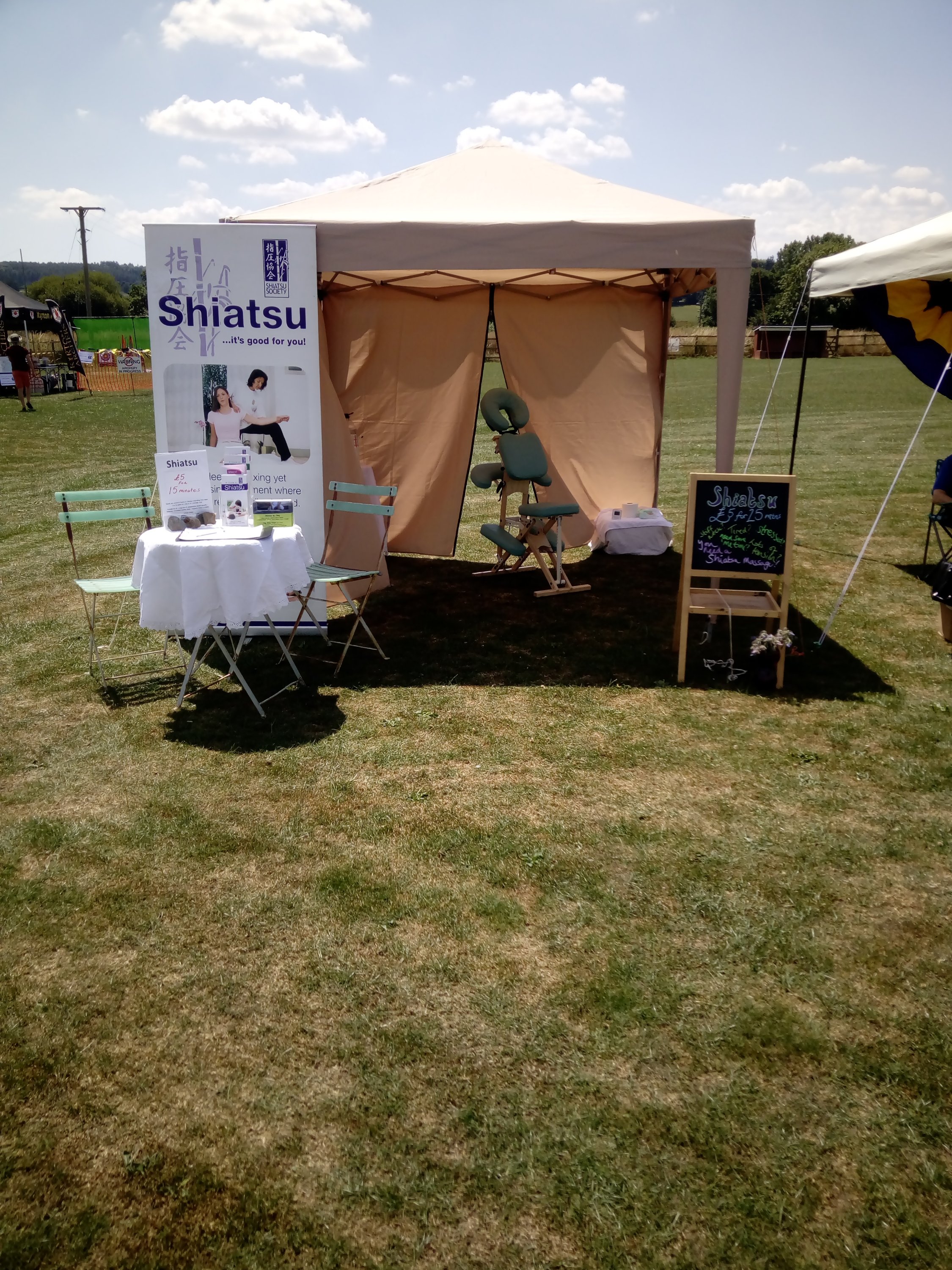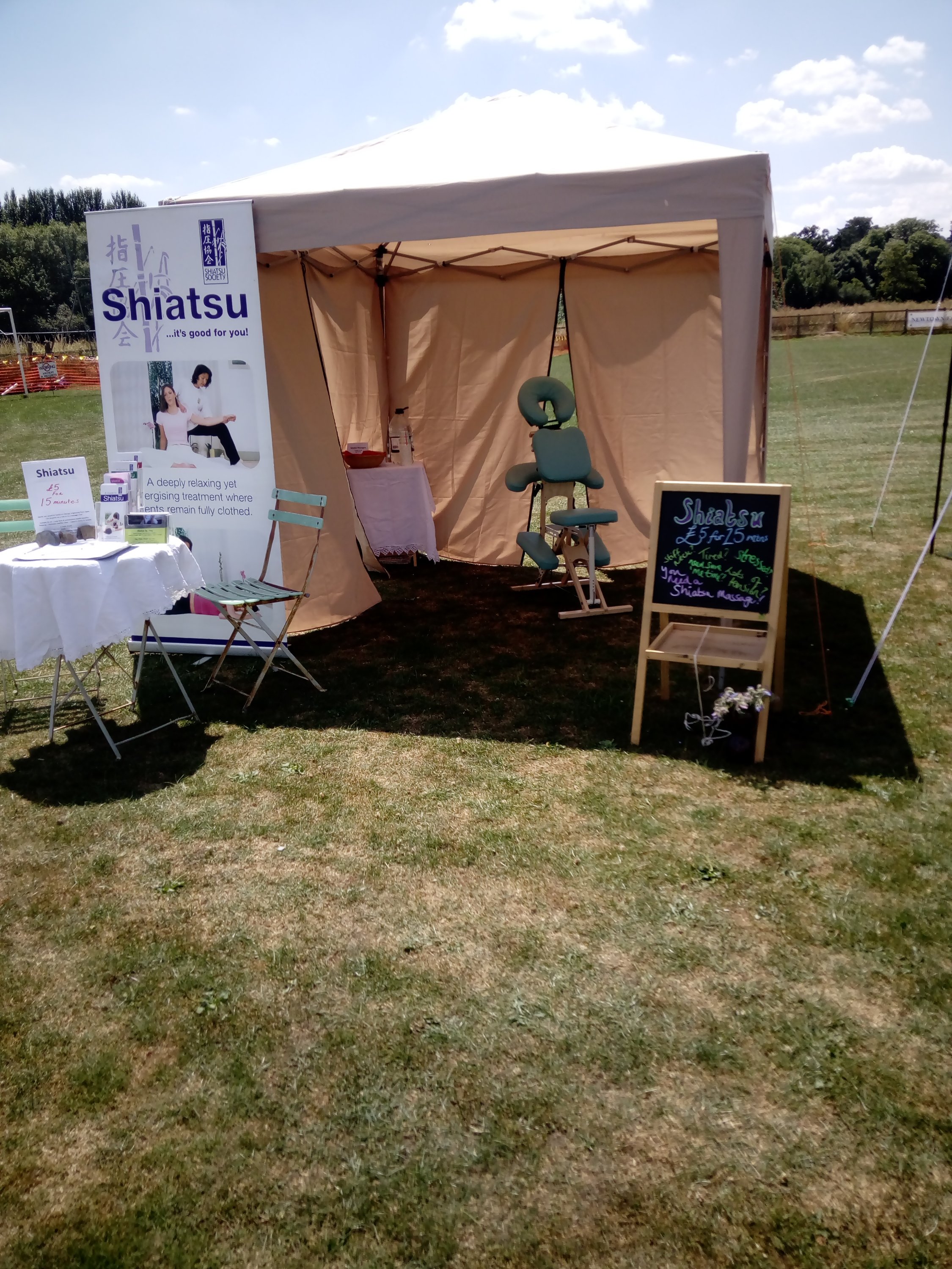 As is nearly always the case I didn’t manage to get anyone to take photos of me actually giving Shiatsu but I did take some photos of my set up looking good in the beautiful sunshine.