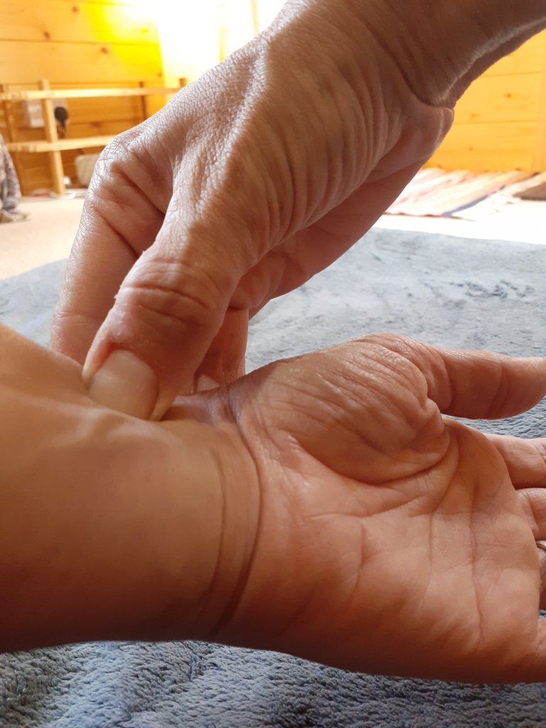 Gently hold the point with a thumb of finger – see if you can feel what pressure it requires. Intention is important when giving Shiatsu so you may want to think about loosening the sinuses and throat or opening the lungs to allow deep breaths of air in.